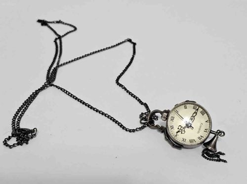 This item is a novelty pendant necklace featuring a small circular watch face housed in a decorative metal casing. The watch is suspended from a gunmetal or darkened silver-toned cable chain. The watch face is cream-colored with black Roman numeral markers and ornate, filigree-style hour and minute hands. The word 'QUARTZ' is printed on the lower half of the dial, indicating a modern battery-powered movement. The case has a rounded, pocket-watch aesthetic with a crown and loop at the top for attachment to the chain. Affixed to the bottom of the watch casing is a small, decorative metal bell charm with three short lengths of chain dangling from it, adding a whimsical or steampunk-inspired element to the design. The metal appears to be a base metal with an antiqued or oxidized finish to give it a vintage look. Condition appears good with no visible scratches on the crystal, though the metal finish shows intentional darkening. The craftsmanship is typical of 21st-century costume jewelry, likely mass-produced for the fashion market rather than a horological heirloom.