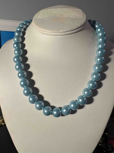 This is a single-strand fashion necklace featuring uniform, spherical light blue beads that mimic the appearance of pearls. The beads are approximately 10mm to 12mm in diameter and possess a high-luster, pearlescent finish with a soft metallic or icy blue sheen. The construction appears to be a traditional strand assembly; however, individual knots between the beads are not visibly prominent, suggesting they may be strung on a durable cord or wire. The color is a consistent pastel blue throughout the visible portion of the strand. From a condition perspective, the beads appear to be in good vintage or contemporary condition, with no immediate signs of significant surface peeling, deep scratching, or discoloration often found in lower-quality costume jewelry. There are no visible maker's marks or signatures on the surface of the beads, and the clasp mechanism is obscured by the display neck. The style is classic and versatile, likely manufactured in the mid-to-late 20th century or as a modern revival piece. The overall craftsmanship suggests a mass-market costume jewelry production rather than a fine jewelry piece, characterized by the synthetic nature of the coating and the uniform shape of the beads.