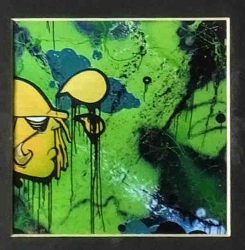 This contemporary 599 x 611 mm artwork is executed on paper, featuring a vibrant and aggressive color palette dominated by lime green, primary yellow, and deep navy blue. The composition is grounded in street art and graffiti aesthetics, utilizing heavy black outlines and intentional paint drips. On the left side of the frame, a stylized, cartoonish figure is visible, rendered in bright yellow with a black hat, long hair or dreadlocks, and an abstract facial structure reminiscent of early 2000s urban character design. The background is a complex layering of splattered paint, washes, and drips, creating a sense of chaotic movement and depth. The application technique suggests the use of markers, spray paint, or high-flow acrylics. The contrast between the saturated yellow character and the textured, dark-veined green background provides high visual impact. While the artist is unknown, the craftsmanship displays a confident hand in line work and a deliberate use of 'decapitated' drips to convey a sense of edge and urban decay. The condition appears to be stable, though the image shows it is housed in a simple metallic or white frame within a dark mount, which might obscure the edges of the original paper. No visible artist signature is discernible on the face of the work, suggesting it may be signed on the reverse or is part of a series. The style suggests it was created in the late 20th or early 21st century.