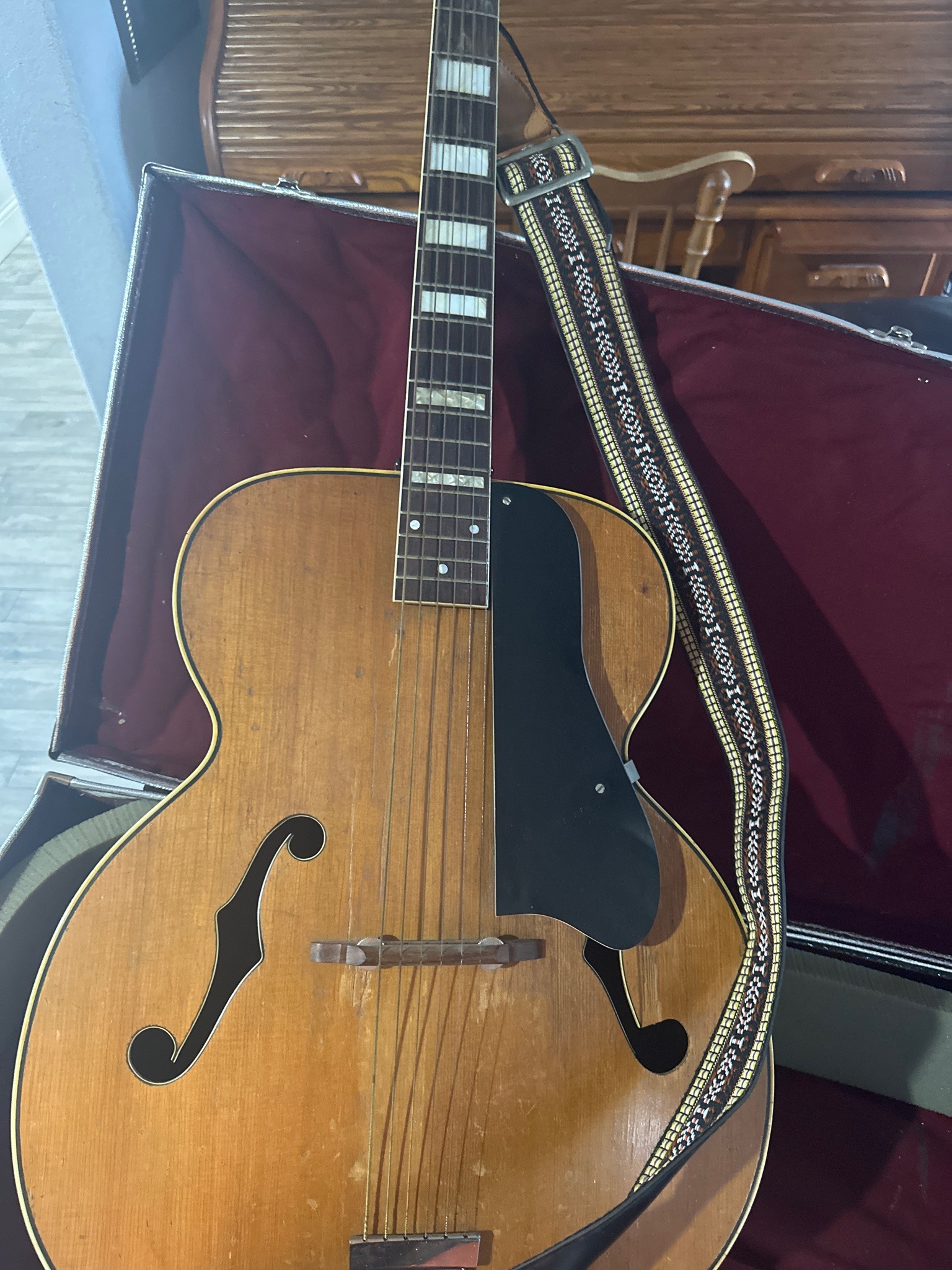 This is a vintage archtop acoustic guitar, likely dating from the mid-20th century (circa 1940s-1950s). The instrument features a large, hollow body construction with a spruce or mahogany laminate top, mahogany or maple back and sides, and a natural aged finish. It is characterized by its dual f-holes with white binding and a distinctive elevated black pickguard. The fretboard is dark-toned wood, possibly rosewood, adorned with oversized rectangular block inlays made of mother-of-pearl or celluloid. The guitar includes a floating adjustable wooden bridge and a metal trapeze tailpiece. It is shown with a woven patterned Hootenanny-style fabric strap and is housed in a plush red-lined hardshell case. Visually, the guitar exhibits significant signs of age and play-wear, including numerous surface scratches, nicks, and finish checking throughout the body. There are visible wear marks on the wood near the bridge and bridge-adjustment area, suggesting consistent historical use. The binding shows a yellowish patina consistent with aged nitrocellulose or plastic. While a specific maker's mark is not visible in the frame, the design elements are highly reminiscent of mid-century models produced by manufacturers such as Kay, Harmony, or Silvertone. The craftsmanship appears robust, typical of the era's mid-tier professional instruments.