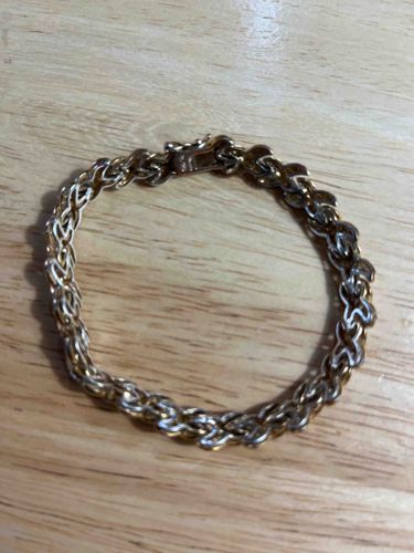 This item is a decorative wrist bracelet featuring a complex, intertwined link pattern typically referred to as a wheat or spiga chain construction. The piece exhibits a two-tone color scheme, blending yellow gold-toned metal with white metal (likely silver-toned or white gold) accents, giving it a versatile and textured appearance. The structure consists of teardrop-shaped or figure-eight links that are woven together to create a fluid, cord-like aesthetic. It is secured with an integrated box-and-tongue clasp that includes a safety latch on one side for added security. The metal shows signs of moderate wear, including minor surface scratches and some tarnishing in the deeper recesses of the links, which is consistent with regular use. While no clear hallmark is visible in the provided image, the craftsmanship suggests a late 20th-century style, approximately 1980s or 1990s. The weight appears substantial for its size, indicating solid construction rather than hollow links. Overall condition is good, with no missing links or broken components observed.