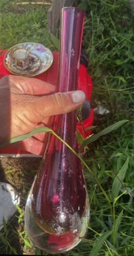 This item is a slender, hand-blown art glass bud vase, likely dating from the mid-20th century, approximately 1950s to 1960s. The vase features a distinctive 'sommerso' or cased glass technique, where a rich cranberry or amethyst-colored interior core is encased within a thick, colorless clear glass base. The form is characterized by an elongated, narrow cylindrical neck that tapers smoothly into a heavy, bulbous teardrop-shaped base. This weighted base provides stability for the tall, narrow silhouette. The glass displays a high degree of transparency and a smooth, polished fire-finish at the rim. While no specific maker's marks are visible in the image, the style is reminiscent of Scandinavian designers like Holmegaard or Italian Murano makers of the period. The condition appears fair to good; there is visible surface grime, water spotting, and minor mineral deposits on both the interior and exterior, which are typical of age and use. No significant chips or cracks are immediately apparent, though fine surface scratches may be present upon closer inspection. The craftsmanship is evident in the even distribution of the interior color and the clarity of the surrounding crystal casing, indicating a piece of decorative quality intended for a single stem.