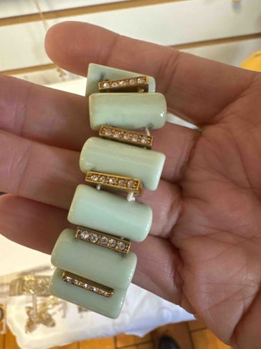 Vintage Celadon Ceramic and Rhinestone Stretch Bracelet