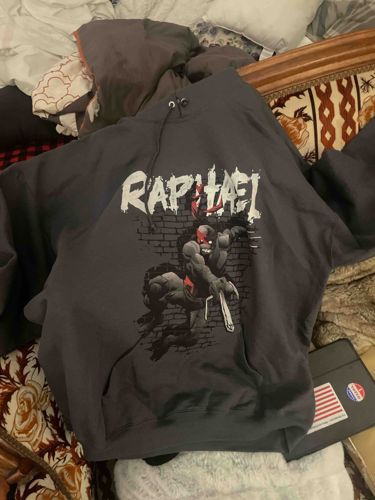 This item is a charcoal gray or dark slate-colored hooded sweatshirt featuring a prominent graphic of the character Raphael from the Teenage Mutant Ninja Turtles (TMNT) franchise. The garment is constructed from a heavy poly-cotton fleece blend, typical of modern streetwear. The central screen-printed graphic depicts a stylized, gritty version of Raphael emerging through a brick wall, brandishing his signature twin sai weapons. Above the character, the name 'RAPHAEL' is printed in a distressed, bold white font that mimics a horror or rock-band aesthetic. The hoodie features a standard drawcord hood with silver-toned metal aglets or grommets, long sleeves, and a kangaroo front pocket. The overall style suggests a contemporary production, likely from the late 2010s or early 2020s, leaning into the 'dark' or 'edgy' nostalgia trend for 1980s-90s pop culture icons. The condition appears to be used but well-maintained, with no visible pilling or major cracking of the graphic, though slight lint accumulation and minor fabric softening from laundering are observable on the textile surface. Workmanship is consistent with mass-market retail apparel.