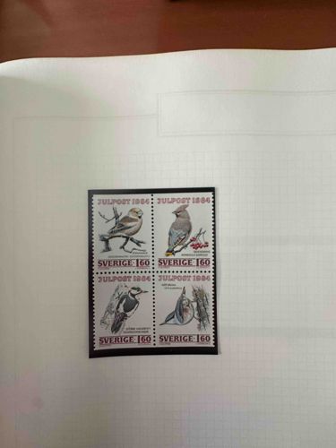 This item is a neat block of four mint-condition postage stamps issued by Sweden for the 1984 Christmas season (Julpost). Each stamp features a detailed ornithological illustration of a native bird species: a hawfinch (Stenknäck), a waxwing (Sidensvans), a great spotted woodpecker (Större hackspett), and a nuthatch (Nötväcka). The stamps are printed on high-quality white paper with clean perforations, displaying vibrant yet naturalistic coloring typical of Scandinavian philatelic design of the 1980s. Each individual stamp has a face value of 1.60 Swedish Krona (Sverige 1.60) and is labeled with the specific year '1984' and the text 'JULPOST'. The artwork is rendered in a realistic, scientific style with the Swedish and Latin names of each bird printed in small text. The block appears to be in 'Mint Never Hinged' (MNH) condition, with no visible centering issues, creases, or gum disturbances. There are no signs of postal cancellations or wear. The craftsmanship is excellent, featuring sharp offset printing that captures the fine detail of the feathers and the textures of the branches and bark upon which the birds are perched.
