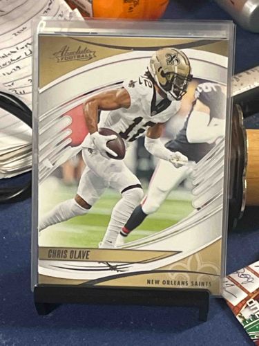 This is a standard-sized modern sports trading card featuring Chris Olave, wide receiver for the New Orleans Saints. The collectible is part of the 'Absolute Football' series produced by Panini America. The card's design features an action photograph of Olave in his white Saints jersey and gold helmet, carrying a football. The aesthetic includes a metallic gold-toned border element across the top and bottom, with sweeping white and silver graphic accents that create a sense of movement. The top left corner displays the stylized 'Absolute Football' logo, while the player's name and team are printed in a clean sans-serif font along the bottom edge. Constructed of multi-layered cardstock with a glossy finish, the card is currently housed in a clear protective sleeve (penny sleeve) inside a semi-rigid top-loader for preservation. The corners appear sharp from this perspective, and the edges seem well-preserved without visible chipping. The centering of the image relative to the borders looks commercially acceptable. There are no signs of surface scratches, creases, or fading. This modern card represents high-quality mass-market sports memorabilia often sought for player-specific collections or team sets.