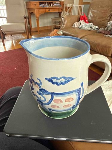Hand-painted Blue and White Stoneware Cow Motif Pitcher