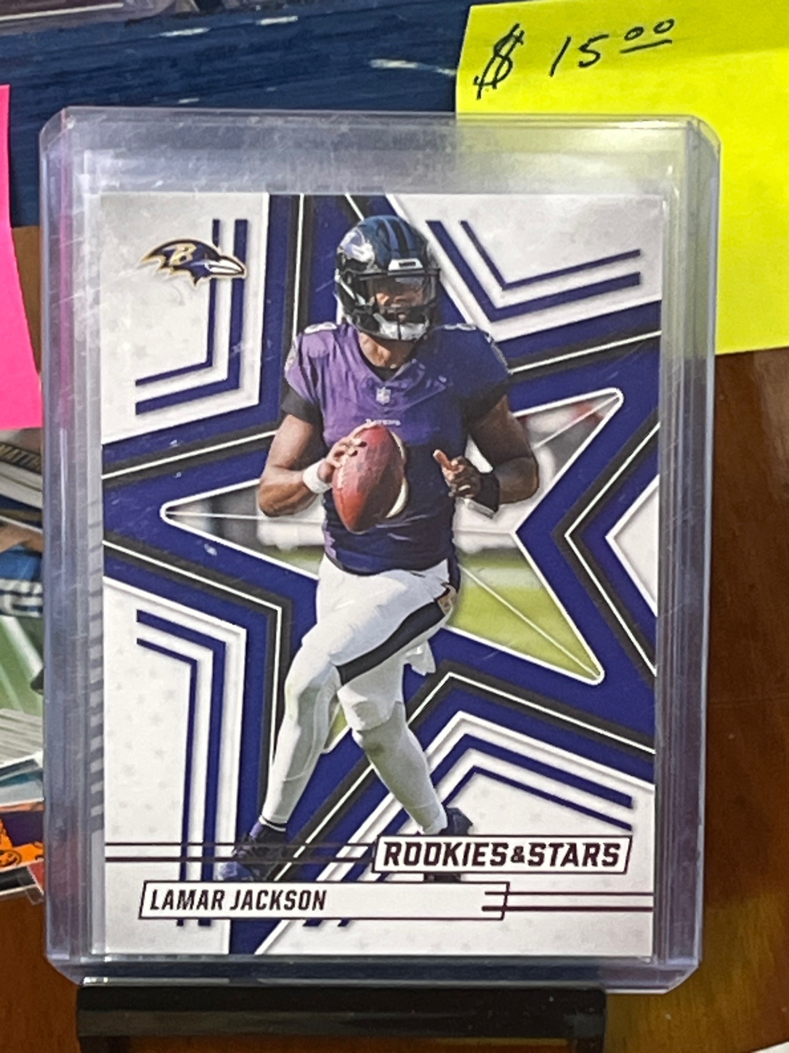 This is a modern American football trading card featuring Baltimore Ravens quarterback Lamar Jackson. The card is from the Panini 'Rookies & Stars' set, likely from a production year between 2019 and 2022 based on the design language. The card face features an action shot of Jackson in his purple home jersey and white pants, holding a football within a large, stylized blue and white star graphic background. The Baltimore Ravens logo is positioned in the upper left corner. The bottom of the card displays the player's name and the 'ROOKIES & STARS' brand logo. Physically, the card appears to be of standard 2.5 by 3.5-inch dimensions and is currently housed in a clear protective 'toploader' plastic sleeve. The card surface shows a clean, glossy finish typical of Panini's high-quality lithographic printing. From a condition standpoint, the corners and edges visible through the protective casing appear sharp and free of significant whitening or 'dinging.' There are no visible surface scratches, creases, or printing defects. The centering of the image and text appears within acceptable industry tolerances. The item is displayed with a yellow sticky note indicating a price point of $15.00, suggesting it is a base card or a common insert rather than a rare numbered parallel or autograph.