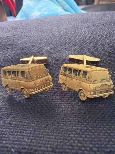 These are a pair of vintage novelty cufflinks featuring a highly detailed three-dimensional representation of a first-generation Ford Econoline van (circa 1961–1967). The cufflinks are constructed from a gold-toned metal, likely brass or gold-plated base metal, exhibiting a warm yellow hue with a slightly matte finish. The level of craftsmanship is high, capturing distinct anatomical features of the vehicle including the 'FORD' block lettering on the front grille, tiny side windows, recessed door lines, wheel hubs, and even windshield wipers. Each cufflink utilizes a standard T-bar (toggle) closure mechanism for securing to a shirt cuff. The toggle bars appear to have some embossed markings, likely patent numbers or maker's hallmarking, though they are partially obscured. In terms of condition, the pair shows signs of light wear consistent with age and use. There is evidence of minor surface oxidation and a light patina in the crevices of the design, which actually serves to highlight the fine details of the van’s bodywork. No major structural damage, such as bent posts or broken hinges, is visible. These pieces are likely mid-century promotional items or automotive enthusiast accessories from the 1960s. Their unique subject matter makes them a desirable collector’s item for both vintage jewelry enthusiasts and Ford automotive historians.