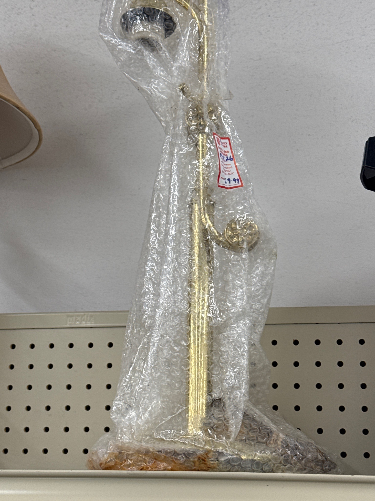 This is a vintage-style table lamp, currently protected by bubble wrap. It is constructed from a polished brass-toned metal, featuring a tall, slender fluted vertical stem that evokes a neo-classical or traditional aesthetic. A notable decorative feature is the ornate scrollwork or 'monkey tail' flourish located near the mid-section of the stem, adding a touch of Victorian or Edwardian revival flair. The lamp utilizes a curved gooseneck arm that supports a downward-facing socket. The shade appears to be a decorative beaded 'cage' style, consisting of dark, possibly amber or smoky glass beads arranged in a tiered circular pattern. The base has a heavy, weighted footprint with a decorative scalloped or lobed edge to ensure stability. While much of the surface is obscured by packaging, the visible metal shows a bright gold-colored finish, possibly a brass plating or high-polish lacquer. There is a red and white price tag affixed to the exterior plastic, indicating it is likely a resale or thrift store find. Based on the construction and hardware, this piece likely dates from the late 20th century (circa 1970s-1990s) and reflects a 'shabby chic' or Hollywood Regency revival style. The overall craftsmanship suggests a mass-produced decorative home accent of moderate quality.