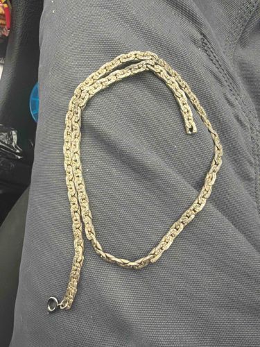 This item is a Byzantine-style link necklace, specifically a boxy, intricate weave characterized by interconnected circular links that create a rope-like aesthetic. The chain is constructed from a yellow metal, which appears consistent with gold as noted in the provided context. The links possess a textured, slightly matte finish, indicating high-quality craftsmanship with a density that suggests significant weight. Physically, the chain features a series of folded links that nested together, resulting in a three-dimensional, tubular structure. The visible color is a warm, classic gold tone with subtle reflections. Regarding condition, there is one evident break or separation in the chain's continuity near the top right of the image, where the weaving has come apart, exposing the internal link structure. At the base, a small circular spring ring clasp is attached via a simple jump ring. The piece exhibits occasional surface grime and light scratches consistent with regular wear and age, likely dating it to the late 20th century. No visible hallmarks or maker's marks are discernable from this distance, but the complexity of the weave suggests a professional jewelry fabrication rather than a handmade artisan piece.