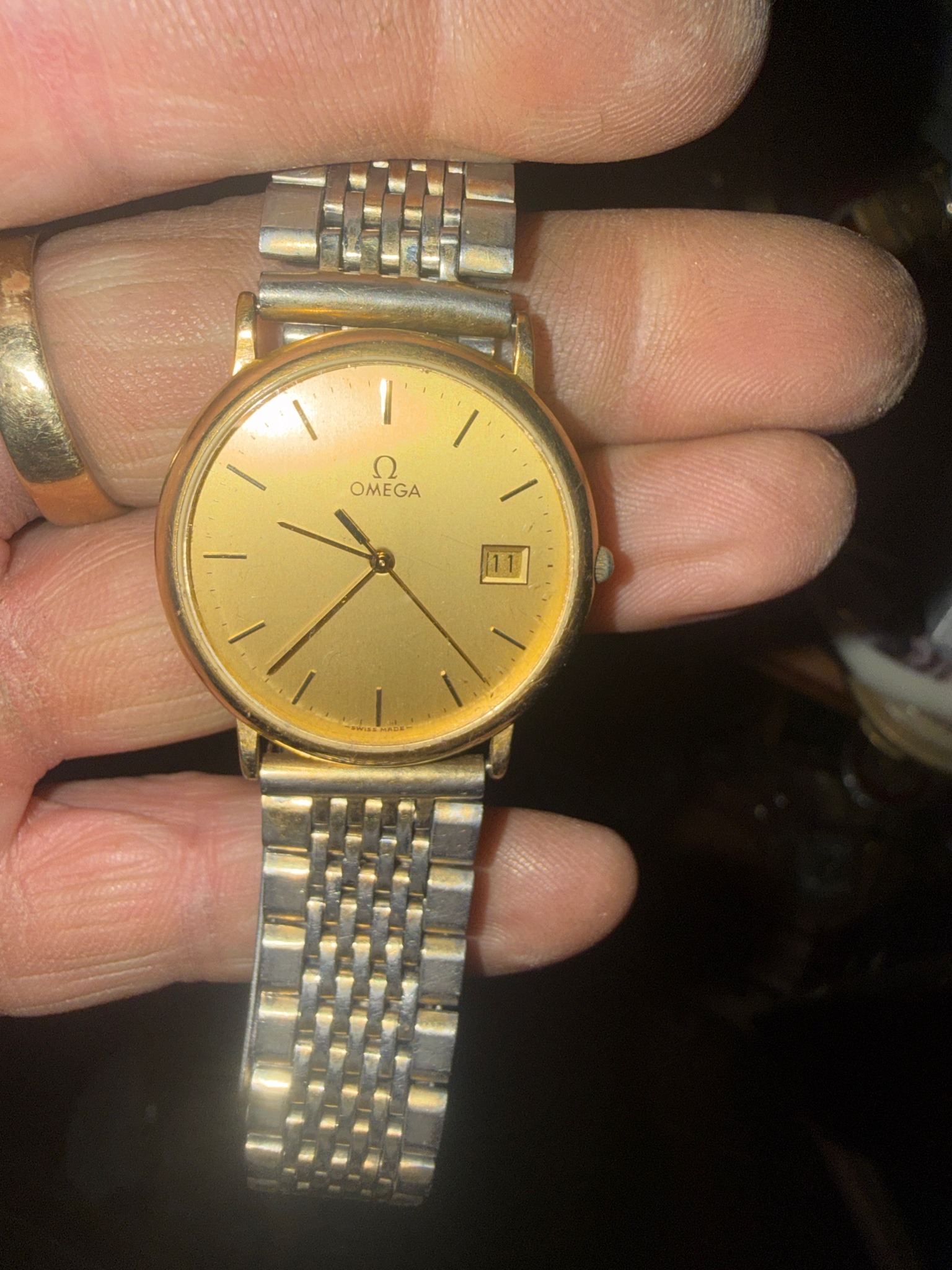 This is a vintage Omega dress watch, likely from the De Ville collection dating to the 1980s or 1990s. The watch features a circular gold-plated or gold-toned case with a matching champagne dial. The dial is minimalist, featuring the classic Omega logo and name at the 12 o'clock position, thin black stick hour markers, and slim baton hands. A date window is positioned at 3 o'clock showing the number '11'. At the bottom of the dial, 'SWISS MADE' is visible. The watch is currently paired with a non-original or aftermarket two-tone stainless steel and gold-tone 'beads of rice' style expandable bracelet, which shows significant wear and mismatchingกับ case lugs. The condition shows notable signs of age and frequent use: there is visible wear on the gold plating around the bezel and lugs, revealing underlying base metal. The crystal appears to have minor surface scratches, and the crown is small and integrated close to the case wall. The overall craftsmanship reflects Omega's mid-to-late 20th-century aesthetic for slim, quartz-driven dress timepieces meant for elegance over sports utility.