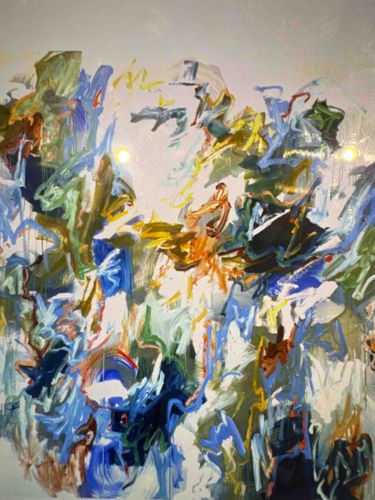 This is a large-scale abstract expressionist painting, likely executed in oil or heavy acrylic on canvas. The composition features a high-energy arrangement of gestural brushstrokes and impasto techniques. The color palette is dominated by various shades of cerulean and royal blue, interspersed with moss green, ochre, sienna, and small accents of vibrant red. The work utilizes a white background which peeks through the dense layers of pigment, creating a sense of depth and movement. Notable features include visible 'drips' of thinned paint near the center-right, suggesting a vertical application method or a deliberate embrace of chance. The application of paint varies from translucent washes to thick, textured ridges, indicating a high level of craftsmanship and artist confidence. While no signature is immediately visible in this view, the style is consistent with mid-to-late 20th-century contemporary abstraction, possibly influenced by the New York School. The condition appears stable, though there are two bright hotspots visible on the surface which are likely reflections from external lighting rather than damage to the artwork itself. The scale and complexity of the mark-making suggest a professional provenance and high artistic quality suitable for formal appraisal.