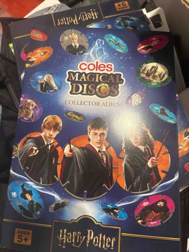 This is a Harry Potter 'Magical Discs' Collector Album, a promotional item released by Coles Supermarkets in Australia around 2020. The album is a large-format cardboard folder featuring a vibrant dark blue and orange cosmic-themed cover. The front displays the main protagonists—Harry Potter, Ron Weasley, and Hermione Granger—alongside smaller circular graphics of other characters like Dobby and Draco Malfoy. These smaller graphics represent the 'Magical Discs' (plastic collectibles) that the album is designed to hold. The cover includes the Coles logo, the 'Magical Discs' title in metallic-style font, and the official Harry Potter branding. Structurally, the album is made of thick, high-gloss laminated paperboard with die-cut circular slots on the interior pages intended to friction-fit a set of collectible plastic discs. This specific unit shows some signs of handling, including minor edge wear and light surface scuffing common with retail promotional items, but remains in overall solid, collectible condition without significant warping or tears. It is intended for ages 5+ and serves as a complete housing unit for the marketing campaign's full set of discs featuring various Wizarding World characters and icons.