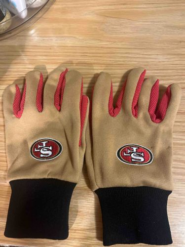 This is a pair of adult-sized utility gloves featuring the official San Francisco 49ers logo. The gloves are constructed from a multi-material design, primarily featuring a tan or khaki-colored jersey-knit fabric on the back of the hands. Contrasting red textured fabric is used for the fourchettes between the fingers, likely providing extra grip and aesthetic appeal consistent with the team's primary colors. The palms are not fully visible but appear to be part of a standard two-piece set. Each glove prominently displays a centralized, high-density heat-pressed or embroidered San Francisco 49ers logo in red, white, and black within an oval border. The wrists are finished with a broad, black elasticized ribbed knit cuff, designed to secure the glove to the wearer's arm and retain heat. The condition appears to be used but well-maintained, with slight pilling on the tan fabric and minor dark smudging on the outer right edge of the right glove's pinky finger area. No major tears, fraying, or holes are visible. These gloves represent mid-to-late 20th-century or contemporary sports fan apparel, commonly sold as stadium merchandise or licensed giftware for cold-weather utility and tailgating.