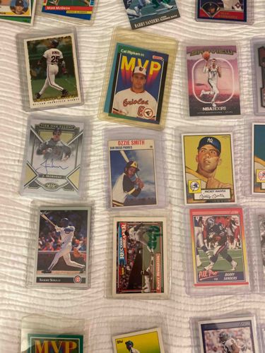 A diverse grouping of roughly a dozen sports trading cards featuring iconic athletes from Major League Baseball, the NBA, and the NFL. Notable items in this collection include a 1989 Donruss Cal Ripken Jr. 'MVP' card, a reproduction or vintage Mickey Mantle card, an Ozzie Smith rookie-era style card, and a Topps Barry Sanders rookie card. The cards are constructed from standard cardstock with various finishes ranging from high-gloss modern surfaces to classic matte cardboard. Each card measures approximately 2.5 by 3.5 inches. Physical protection is evident as most cards are housed in clear plastic top-loaders or semi-rigid sleeve protectors, which have helped preserve the corners and edges from significant blunting. The condition appears mixed; while some modern cards like the Rickey Henderson 'Record Breaker' exhibit sharp corners, older vintage-style cards show slight surface wear and natural age-related discoloration on the reverse sides. No major creases or water damage are visible in the provided image. This collection spans several decades of manufacturing, including brands like Topps, Donruss, and NBA Hoops, making it a comprehensive cross-section of sports hobby history from the late 1960s to the 1990s and early 2000s.