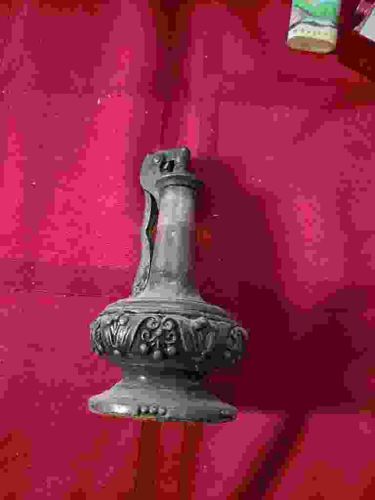 This object is a vintage table lighter designed in the shape of a classical urn or ewer. Constructed from a non-magnetic base metal, likely a zinc alloy or pot metal, it features what remains of a silver-plated finish. The item measures approximately 4 to 5 inches in height and stands on a flared circular pedestal base. The central body is heavily decorated with an ormolu-style relief featuring scrolling acanthus leaves, swags, and grape clusters, suggesting an aesthetic influenced by Neo-Classical or Victorian Revival periods. Above the ornate body is an elongated cylindrical neck which houses the mechanical flint-and-fuel lighter mechanism. The mechanism appears to be a lift-arm or plunger-style lighter, common in the mid-20th century. The item shows significant signs of age-related wear, including heavy oxidation, pitting, and the loss of its original plating, giving it a dark, mottled grey patina. There are no clearly visible maker’s marks in the current view, but these were often stamped on the underside of the base. The weight and casting quality suggest a mass-market decorative accessory from the 1940s to 1960s, intended for use on a coffee table or desk in a formal interior setting.