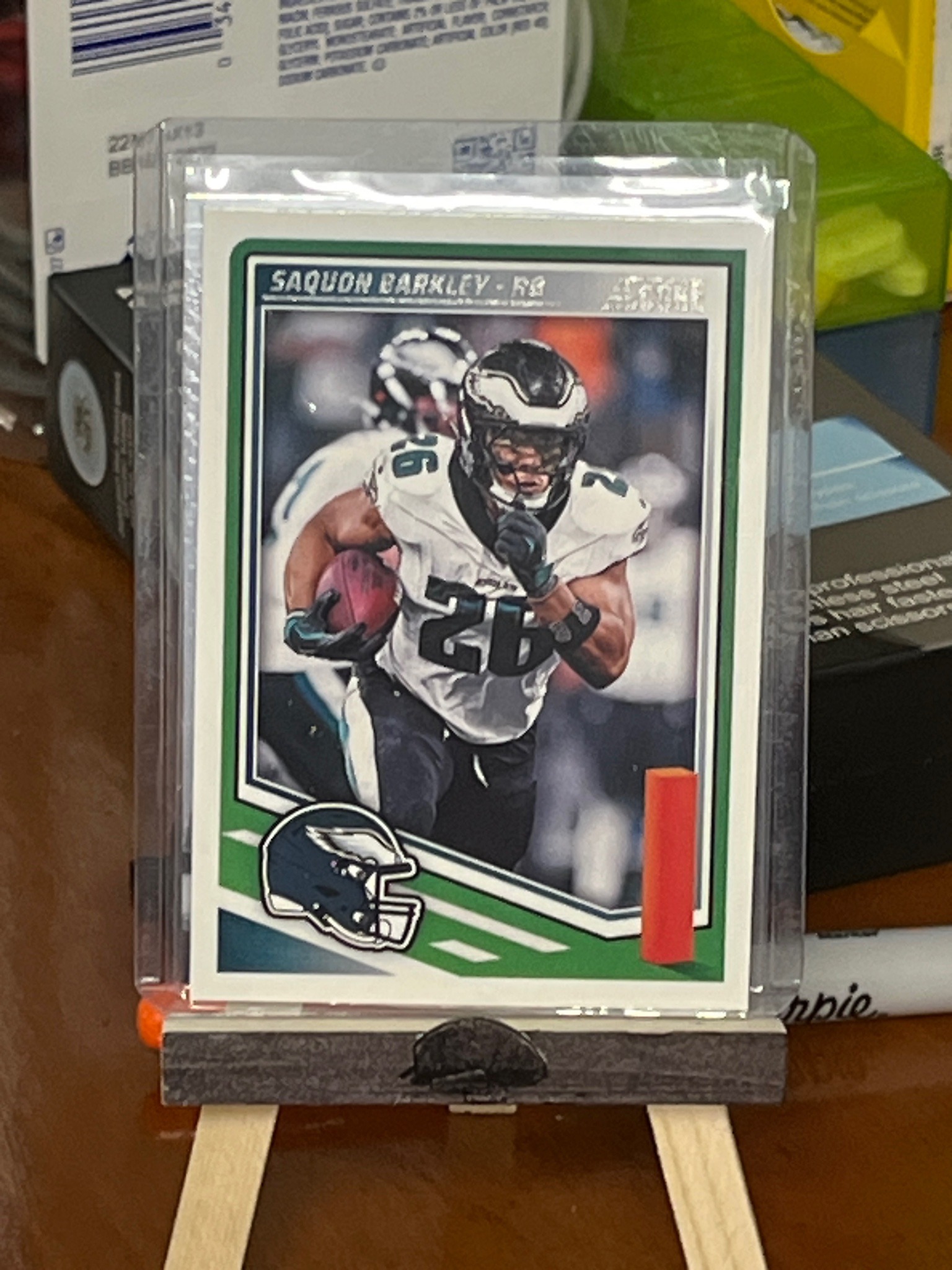 This is a 2024 Panini Score series trading card featuring running back Saquon Barkley in his Philadelphia Eagles uniform. The card follows a classic vertical layout with a white outer border and a Philadelphia Eagles midnight green inner frame. The design features a high-action color photograph of Barkley carrying the football, with a secondary player blurred in the background. Notable graphics include the 'Saquon Barkley - RB' text at the top left and the 'Score' brand logo in the upper right. The bottom left features a detailed Philadelphia Eagles helmet logo graphic. Physically, the card appears to be standard 2.5 x 3.5 inch trading card size, printed on gloss-coated cardstock. Regarding condition, the card is housed in a clear protective sleeve and a rigid plastic top-loader, resting on a miniature wooden display easel. From a visual inspection, the centering looks slightly heavy toward the left and bottom borders. The corners appear sharp through the plastic housing, and there are no immediately visible surface scratches, creases, or printing defects. As a 2024 release, this represents one of the earliest cards of Barkley following his high-profile move from the New York Giants to the Eagles, making it a significant 'team change' card for collectors.