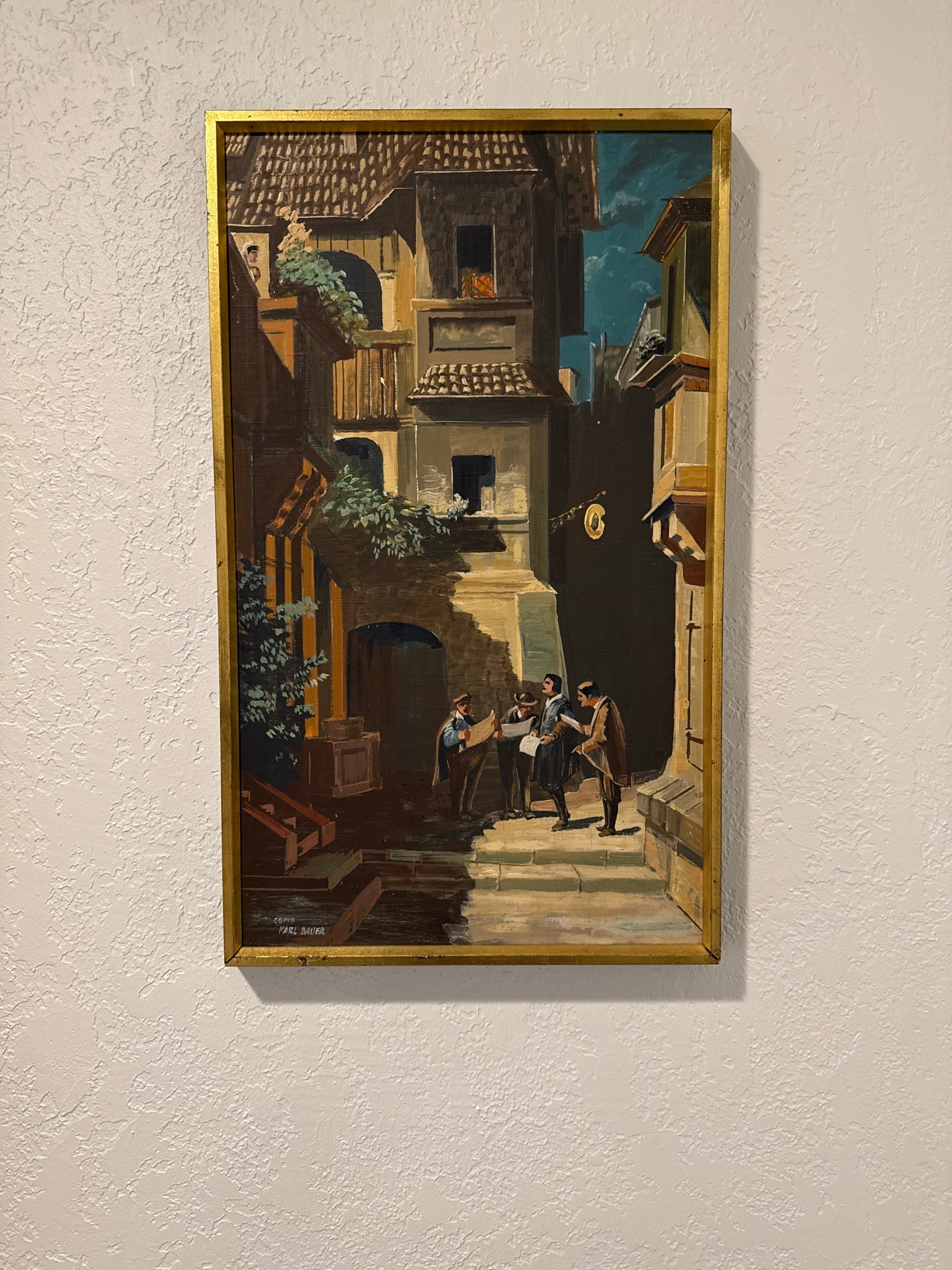 This is a vertical oil painting on canvas depicting a group of four men in historical European attire gathered in a cobblestone town square or alleyway. The men appear to be intently studying documents or maps. The architectural setting features tall, multi-storied timber-framed buildings with tiled roofs and flower boxes, reminiscent of 18th or 19th-century German or Austrian towns. The color palette is dominated by earthy browns, deep shadows, and ochre highlights, with a striking contrast provided by a slice of dark blue night sky. The brushwork is expressive and impastoed in certain areas, particularly in the highlights on the stone steps. In the lower-left corner, the work is clearly marked with the inscription 'COPIE' above the name 'KARL BAUER' in white block letters. This indicates that it is a mid-century academic or commercial copy of an original composition by the German artist Karl Bauer (1868–1942). The painting is housed in a simple, slim gold-toned wooden frame that shows minor surface scuffing and age-related wear. The canvas tension appears adequate, though there is visible surface grime consistent with age and typical of 20th-century decorative artworks. The craftsmanship is competent, capturing a nostalgic, romanticized view of historical European life through strong chiaroscuro techniques.