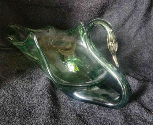Mid-Century Murano Style Green Art Glass Swan Bowl