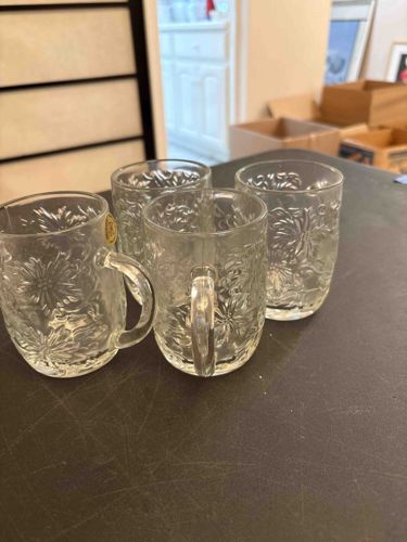This is a set of four clear pressed-crystal mugs featuring a dense, floral embossed pattern that appears to represent a Poinsettia or similar botanical starburst motif. Based on the construction and the visible gold foil manufacturer's label on the leftmost mug, these pieces likely originate from a prominent 20th-century glassmaker such as Fostoria or a comparable high-quality American glass house. Each mug features a C-shaped handle attached to a rounded, barrel-shaped body. The glass is clear and brilliant, suggesting a high lead content characteristic of fine crystal. The exterior texture is deeply molded with overlapping petals and leaves, providing both tactile grip and light refraction. In terms of condition, the glass appears bright without significant clouding or 'glass sickness.' There are no immediate signs of large chips or cracks, though some minor shelf wear on the bases and manufacturing mold lines are expected. The presence of the original gold sticker is a strong quality indicator, suggesting these may have been part of a seasonal holiday collection or a 'select' line from the mid-to-late 20th century. The craftsmanship is consistent with high-end pressed glass, where the pattern remains crisp and the seams are relatively well-integrated into the design.