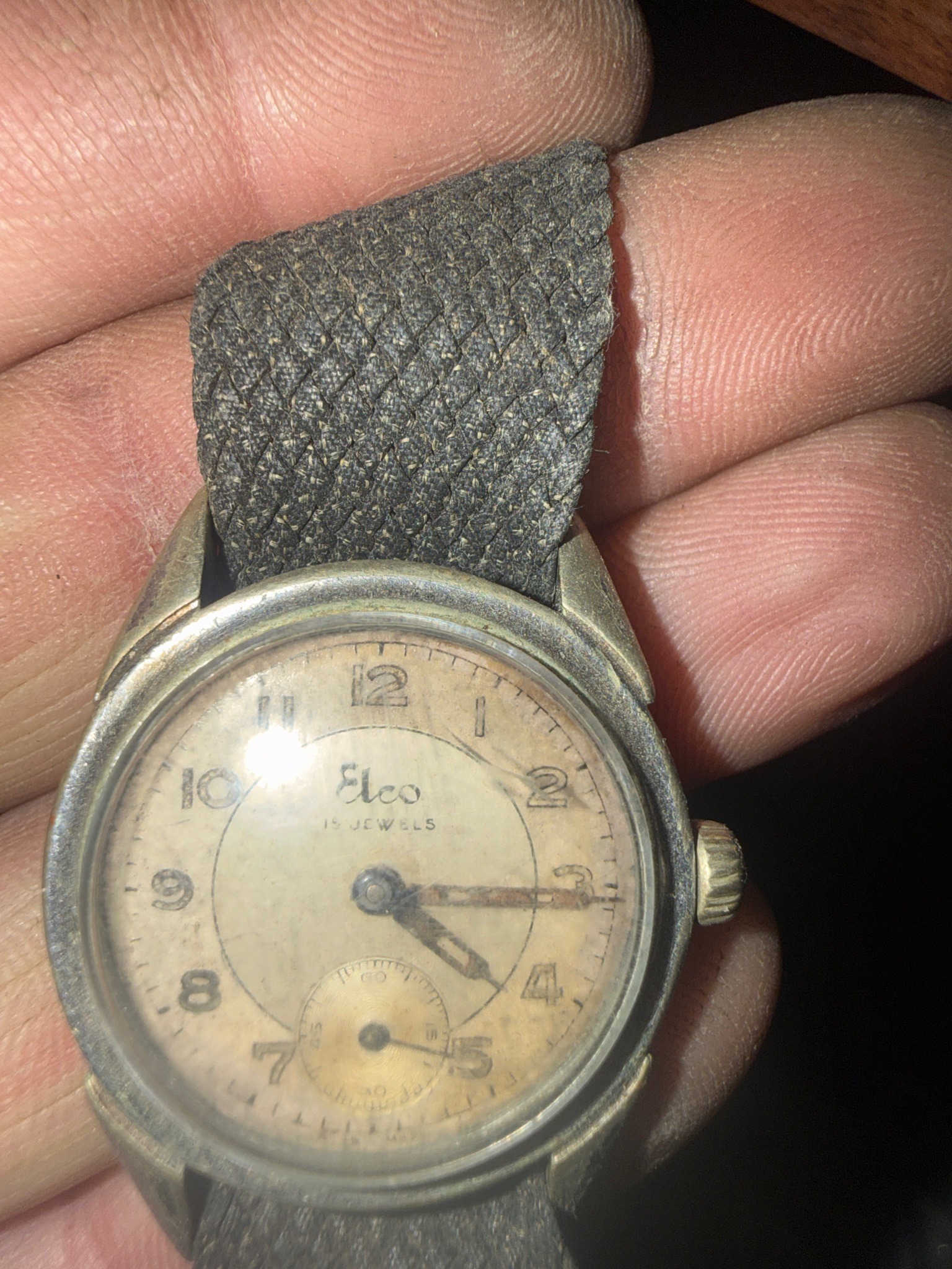 This is a mid-20th-century vintage wristwatch manufactured by Elco, likely dating from the 1940s to early 1950s. The watch features a circular stainless steel or base metal case with a distinctively worn, matte patina and downturned lugs. The dial is off-white or cream-colored, showing significant age-related foxing and discoloration across the surface. It is designed with stylized Arabic numeral hour markers and a secondary small seconds sub-dial located at the 6 o'clock position. The branding 'Elco' is prominently printed below the 12 o'clock marker, followed by '15 JEWELS,' indicating the complexity of the manual-wind mechanical movement within. The hands are cathedral or syringe-style, exhibiting noticeable oxidation and loss of original luminous material. The watch is currently fitted with a grey, braided perlon-style nylon strap that appears heavily used and frayed at the end. Condition-wise, the timepiece shows heavy wear consistent with age, including scratches on the acrylic crystal and metal casing, as well as significant grime buildup around the bezel and crown. This utilitarian style is characteristic of mid-century field or dress watches from smaller Swiss or American assemblers of that era.