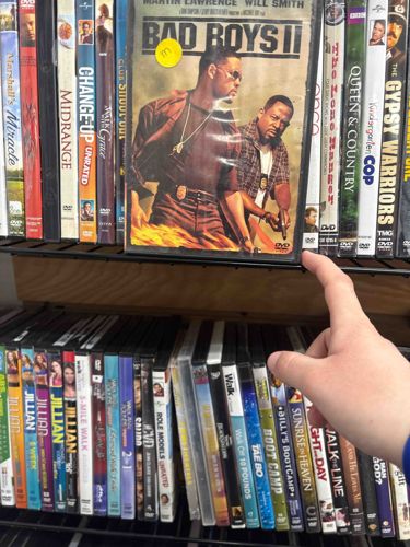This is a standard retail DVD edition of the 2003 action film 'Bad Boys II,' starring Will Smith and Martin Lawrence. The item is housed in a traditional black plastic 'keep case' with a clear plastic overlay holding the printed paper cover art. The cover art prominently features the two lead actors against a backdrop of fire and includes the title in bold lettering at the top. Physically, the case measures approximately 7.5 by 5.3 inches. Notable markings include a bright yellow circular price or identification sticker on the upper left corner of the front cover. The condition appears used; there is visible scuffing and light scratching on the exterior plastic film, and the edges of the paper insert show minor shelf wear. The spine of the case is visible in a dense row of other DVDs on a black wire shelf, suggesting a second-hand retail environment such as a thrift store or media exchange. No specific region codes or special edition markings (like 'Widescreen' or 'Collector's Edition') are immediately legible on the front, though the DVD logo is present at the bottom right. The item likely dates from the original home video release period in the mid-2000s.