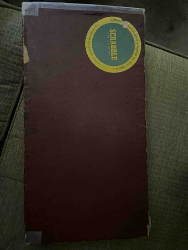 This is a vintage long-form Scrabble board game box, specifically the mid-century edition produced by Selchow & Righter Co. The box features a deep maroon or burgundy textured cardboard exterior, likely containing wooden tiles and a folding game board typical of the 1950s production era. A prominent circular green and yellow seal or sticker is affixed to the upper right corner, displaying the 'SCRABBLE' trademark alongside the manufacturer's name, 'Selchow & Righter Co., New York, N.Y.', and the patent registration 'Reg. U.S. Pat. Off.' The construction is rectangular and elongated, designed to accommodate the full-length wooden tile racks. Visible condition issues include significant edge wear, moderate scuffing across the paper surface, and clear adhesive tape reinforcements on the top left and bottom left corners, suggesting the original cardboard seams have split. There are minor abrasions and surface loss on the bottom right edge. This version is a classic example of American post-WWII tabletop gaming, characterized by its utilitarian but durable materials and iconic minimalist branding. The craftsmanship is standard for mass-marketed 20th-century paperboard games, and its age can be pinpointed to the early 1950s based on the specific logo design and manufacturing address provided on the seal.
