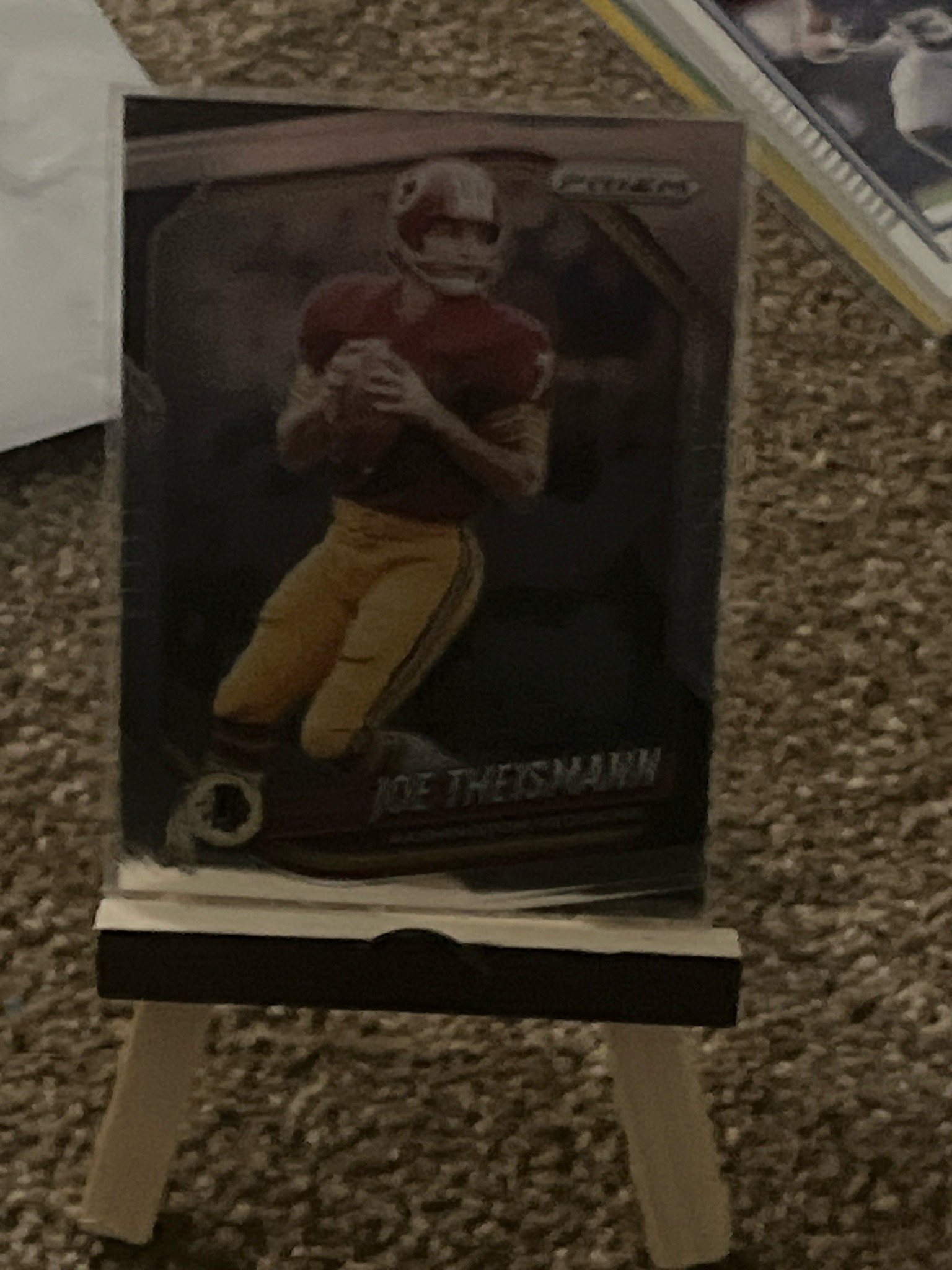 This is a modern era football trading card featuring legendary Washington Redskins quarterback Joe Theismann. The card is produced by Panini under their premium 'Prizm' brand, identifiable by the distinctive logo in the upper right corner and the high-gloss metallic finish. The card features an action shot of Theismann in his classic Redskins burgundy jersey and gold pants, clutching a football. Physically, the card is standard size (2.5 by 3.5 inches) and constructed from a heavy cardstock with a chrome-like laboratory-enhanced coating that gives it a reflective, refractive sheen. The framing includes a 'Prizm' border design with the player's name clearly printed at the bottom and the team logo in the bottom left corner. In terms of condition, the card is housed in a clear protective plastic sleeve and displayed on a miniature wooden easel. Visible through the sleeve, the corners appear relatively sharp and the centering looks decent, though a professional grading would be required for a definitive condition report. The craftsmanship is typical of high-end modern sports cards, utilizing multi-layer printing processes to create depth and visual texture.
