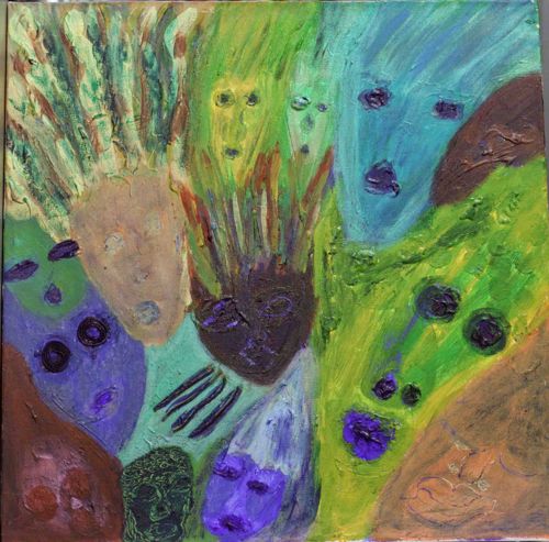 This is an original mixed-media painting, likely oil or heavy-bodied acrylic on a square canvas or board. The composition features a dense, chaotic arrangement of stylized human faces and heads, each rendered in a distinct, vibrant palette including shades of violet, turquoise, ochre, forest green, and deep umber. The application of paint is highly impasto, with visible, heavy brushstrokes and textural layering that suggests a contemporary or late 20th-century expressionist style. One central figure has dark, spiky hair and a chocolate-brown face, while another to the left is cast in a ghostly pale tan with radiating yellow strokes. The facial features are minimalist and slightly distorted, characterized by dark, hollowed-out circular eyes and simple line-work for mouths. There are unusual elements such as dark, claw-like scratch marks in the center and textured circular motifs on the right. The artwork appears to be in fair condition, though there is a noticeable vertical crease or surface fracture running down the upper-left quadrant and some minor scuffing along the edges. No visible signature or maker's marks are present on the face of the work, pointing toward an emerging or outsider artist. The overall craftsmanship is raw and energetic, prioritizing emotional impact over anatomical accuracy.
