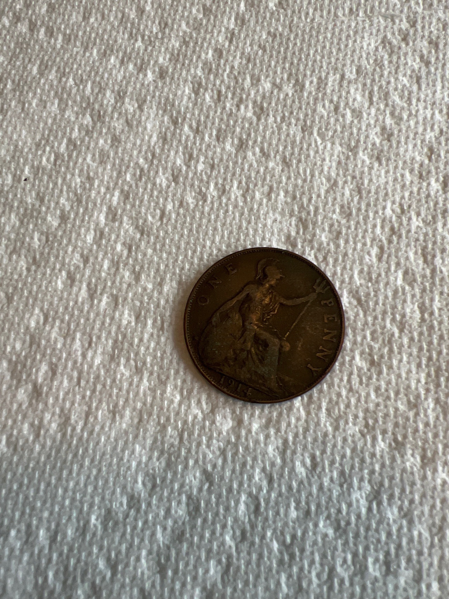 This is a 1914 British One Penny coin, commonly referred to as a 'Large Penny'. It is struck in bronze, which typically consists of 95% copper, 4% tin, and 1% zinc. The coin measures approximately 30.8mm in diameter with a weight of roughly 9.4 grams. The reverse side visible in the image features the seated figure of Britannia, facing right, wearing a helmet and holding a trident in her right hand. Her left hand rests on a shield decorated with the Union Flag. The words 'ONE' and 'PENNY' are inscribed on either side of the figure, and the date '1914' is located in the exergue at the bottom. The edge is plain without reeding. Regarding condition, the coin displays a deep, dark brown patina consistent with long-term circulation and biological exposure. There is significant wear evident on the high points of Britannia's knees, torso, and helmet, indicating a grade likely in the 'Very Good' to 'Fine' range. Minor surface debris and localized spotting are visible, but the strike remains legible. This specimen hails from the early years of King George V's reign and was minted during the outbreak of World War I.