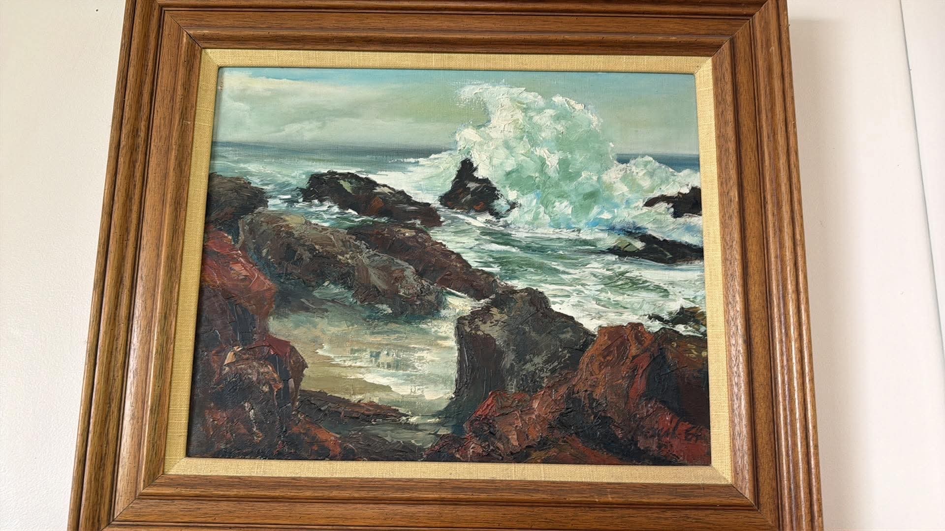 This is a dramatic mid-century seascape oil painting on canvas, characterized by a heavy impasto technique that provides significant texture and depth. The composition depicts a powerful ocean wave crashing against dark, jagged coastal rocks. The color palette is dominated by deep umbers and burnt sienna in the rocky foreground, contrasting with the frothy whites, pale mint greens, and cerulean blues of the surf. The sky is rendered in muted, overcast tones of grey and pale yellow. The artist has utilized thick palette knife strokes and heavy brushwork to create a sense of movement and raw energy in the water. The piece is housed in a substantial tiered wooden frame with a natural grain finish and a beige textured fabric liner, typical of mid-20th-century California or coastal gallery styles (spanning roughly 1950-1970). Looking closely at the lower right corner, there appears to be a faint signature and date, possibly ending in '64' or '67'. The condition appears good with some minor dust accumulation and slight yellowing of the varnish consistent with age; however, the frame shows some minor surface wear at the corners and a small gap between the canvas and the liner. The craftsmanship reflects a professional hand, showing mastery of light through the translucent crest of the wave.