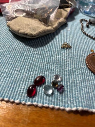 This collection consists of several loose gemstones displayed on a textured blue surface. The assortment includes two deep red oval cabochons, likely garnets or high-quality glass, showcasing a smooth, polished surface with significant light refraction at the edges. Adjacent to these are several faceted stones: one pale blue round brilliant cut (resembling aquamarine or blue topaz), a clear white round brilliant cut (likely white topaz, sapphire, or cubic zirconia), and a smaller dark purple rectangular faceted stone, possibly an amethyst or rhodolite garnet. A small brownish-green round stone is also visible. The stones appear to be in good condition with no immediate evidence of surface chips or structural cracks visible to the naked eye, although microscopic inspection would be required for a definitive grading. The variety suggests these are either unset stones for jewelry making or stones removed from previous settings. The craftsmanship in the faceting appears consistent with modern commercial standards. In the background, additional jewelry components including chains, a medallion, and a storage pouch are visible, suggesting a hobbyist or estate collection context.