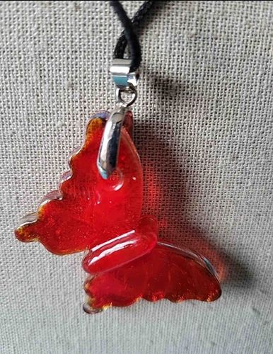 This statement necklace features a large butterfly-shaped pendant crafted from translucent cherry-red glass. The piece appears to be made using a slumping or kiln-forming technique rather than traditional free-blowing, resulting in a thick, substantial profile with smooth, rounded edges. The glass displays internal texturing and micro-bubbles (seeds), consistent with artisan-made glass, which creates a shimmering effect when light passes through. The butterfly wings are asymmetrical and stylized, with a raised central 'body' section. It includes a polished white-metal pinch bale with a bright chrome-like finish, transitioning to a simple black cord. The overall construction suggests a contemporary piece, likely late 20th to early 21st century, emulating the Venetian glass traditions of Murano. While no signatures or labels are visible on the glass itself, the clarity and saturation of the red pigment indicate quality craftsmanship. The condition appears excellent with no visible chips, fractures, or significant surface scratches, and the metal bail shows high luster without significant oxidation or wear.