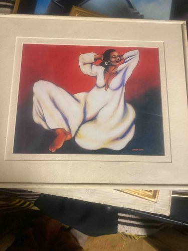 This item is a framed fine art print featuring a stylized depiction of a Black woman in a relaxed, seated pose. The figure is dressed in a voluminous, flowing white garment that creates high contrast against a vibrant, saturated red background that transitions into deep shadows. Her hands are elegantly positioned behind her head. The artistic style is characteristic of late 20th-century African American figurative art, emphasizing bold colors and rhythmic, organic lines. The piece is signed 'Lawrence Green' in the lower right corner, likely representing the artist's work from the 1980s or 1990s. Physically, the artwork is house-framed under a wide, off-white double-stepped mat within a simple, narrow white frame. Notable details include the masterful use of chiaroscuro to define the folds of the white fabric and the warmth of the figure's skin tones. In terms of condition, the outer frame exhibits some surface grime and minor scuffing consistent with age and storage. The matting appears intact, though there may be minor yellowing due to age. This piece reflects significant cultural craftsmanship, capturing a serene and empowered feminine subject through a modern lens.
