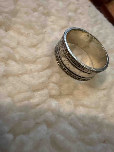 This is a wide-profile band ring crafted from sterling silver, featuring a unique multi-textured aesthetic. The ring's construction consists of a stout, polished inner band that serves as a foundation for external decorative elements. Specifically, it showcases two parallel raised braided or rope-twist borders that frame the central circumference of the piece. The metallic color is characteristic of aged silver, displaying a cool white luster interspersed with significant dark grey and blackish oxidation. This patina is particularly heavy within the recessed areas of the braided design, which serves to emphasize the intricate texture of the metalwork. In terms of condition, the ring shows clear signs of regular wear, including numerous fine surface scratches, small nicks, and a dulling of the original high-polish finish. The interior of the band appears smooth, though also exhibiting some moderate tarnish. While no specific maker's mark or '925' hallmark is visible in the current photograph, the weight and oxidation pattern are consistent with solid sterling silver construction. The style suggests a bohemian or southwestern influence, likely produced in the late 20th century. The craftsmanship is solid and utilitarian, typical of artisan-style jewelry designed for durability and daily use.