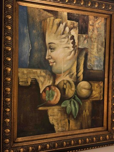 This is a mid-to-late 20th-century original oil painting on canvas, characterized by its surrealist and neo-classical aesthetic. The composition features a fragmented female face in profile with crown-like architectural elements, juxtaposed against a still life of peaches and foliage. The palette is dominated by earthy siennas, muted golds, and deep cerulean blues, applied with visible impasto and textural layering that gives the piece a tactile, aged quality. The artist utilizes dramatic chiaroscuro to define the rounded forms of the fruit and the contours of the face. In the lower right corner, a signature appears to read 'M. Fox' or a similar derivative. The artwork is housed in a contemporary ornate wooden frame with a gilded finish, featuring a repeating egg-and-dart motif or beaded texture along the outer border. The condition appears to be excellent with no visible craquelure, paint loss, or sagging of the canvas. The style is reminiscent of mid-century surrealism, blending figurative portraiture with traditional still life elements to create a dreamlike, allegorical scene. The craftsmanship shows a confident hand in both anatomy and the rendering of light and shadow.
