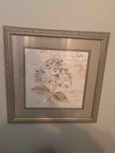 This item is a square-format decorative wall art piece featuring a botanical illustration of a hydrangea. The artwork is executed in a soft, impressionistic style with a palette of muted lavenders, dusty blues, and sage greens. The background of the print incorporates a vintage 'shabby chic' aesthetic, stylized with faux-distressing, sepia-toned washes, and decorative cursive script that mimics old French correspondence. The piece is professionally presented in a double-bordered arrangement. It features a wide, pale-taupe inner mat that is enclosed by an ornate, metallic-finished frame. The frame displays intricate beaded and floral relief patterns along the outer and inner edges, finished in a tarnished gold or champagne silver tone that suggests a neoclassical or traditional influence. The construction appears to be contemporary mass-produced decorative art, likely from the late 20th or early 21st century. The condition appears sound with no visible foxing on the print, though the glass shows minor surface reflections and typical dust accumulation. The frame's corners appear tight with no significant chipping or loss to the gilded finish. There are no prominent maker’s marks visible on the face, indicating it is likely a retail decor item intended for residential use.