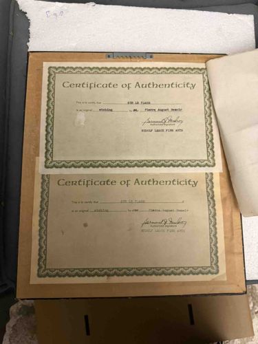 This item consists of two vintage Certificates of Authenticity (COA) issued by Rudolf Lesch Fine Arts, affixed to the reverse of a framed artwork. The COAs identify the piece as an original etching titled 'Sur la Plage' by the renowned French Impressionist artist Pierre-Auguste Renoir. The certificates feature a green decorative guilloche border on aged, cream-colored paper. They include typewritten details and an authorized signature from Rudolf Lesch Fine Arts. The certificates appear to be on acidic paper, showing significant yellowing, foxing, and visible staining, particularly on the lower document. The paper is attached to a brown cardboard backing. A metal saw-tooth picture hanger is visible at the top edge of the frame. The presence of two identical COAs suggests either two separate impressions of the etching were handled or one is a carbon copy. Rudolf Lesch was a prominent mid-20th-century New York art dealer known for distributing prints, and these documents likely date to the mid-1900s. The etching itself is not visible in the frame, but the documentation suggests a restrike or a posthumous edition typical of Renoir's graphic works sold through such galleries.