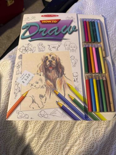 This is an 'Action Pack' brand 'How To Draw' instructional art kit, likely dating from the mid-to-late 1990s based on the graphic design and typography. The kit consists of an oversized softcover instructional book housed in a specialized cardboard folder. The front cover features a central illustration of a Spaniel dog and a white kitten, surrounded by instructional sketches showing basic shapes. The right side of the folder features a built-in plastic tray containing three rows of colored pencils and shading pencils, though one full-length shading pencil appears significantly longer than the others, and a 2B pencil is visible. The kit appears to be in used condition; there is a secondary adhesive price tag from 'St. Anne Thrift Shop' for $1.25 placed over the kitten illustration. Notable condition issues include minor scuffing on the cover edges, some indentation marks on the cardboard, and the presence of the thrift store sticker which may leave residue upon removal. The 'Action Pack' logo is printed in a red bubble at the top, and the 'How To Draw' title features a distinctive 90s-style teal gradient and drop shadow. The craftsmanship is typical of mass-produced educational stationery from that era, using standard cardstock and plastic blister packaging to integrate the tools with the manual.