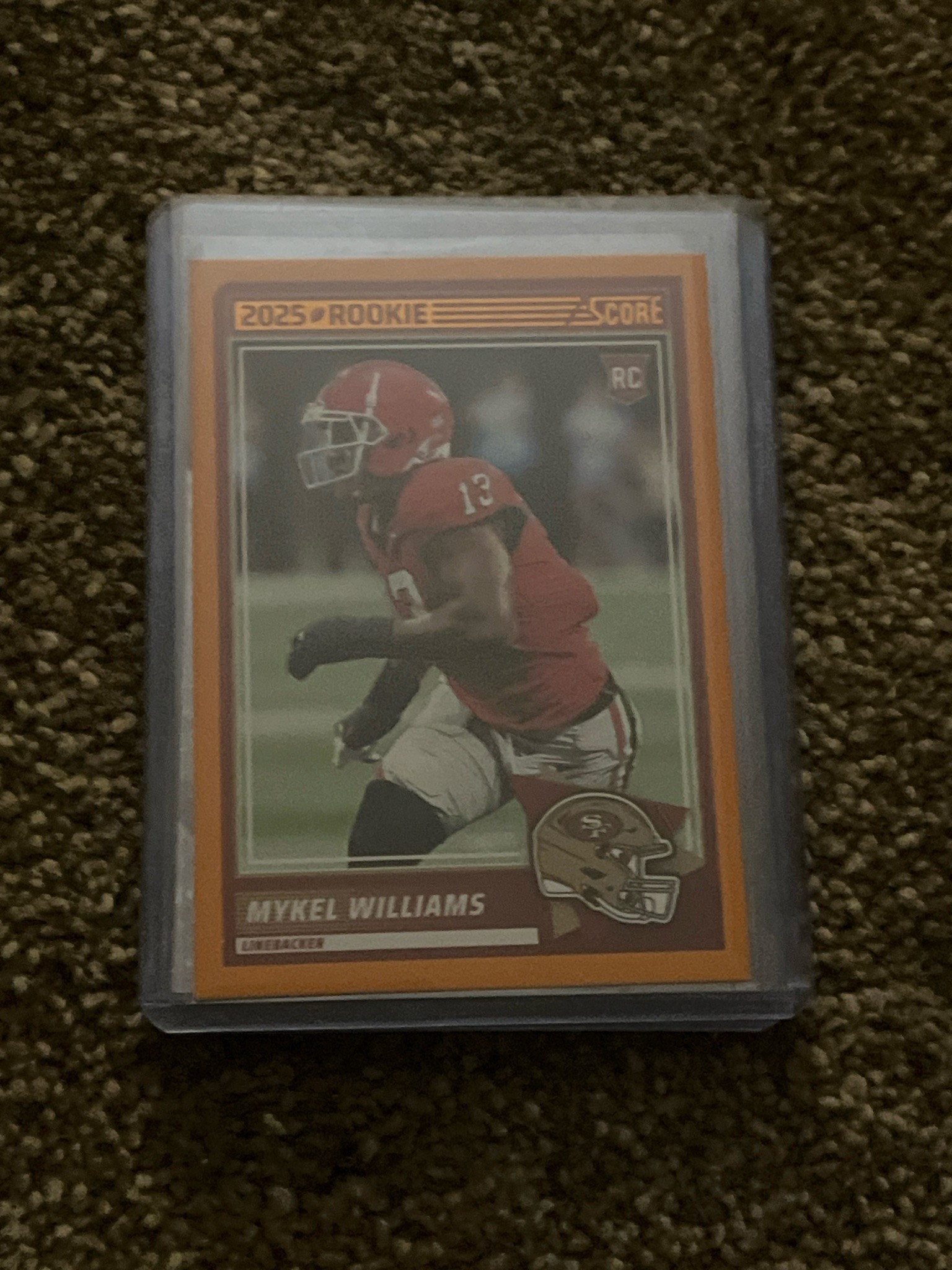 This is a 2025 Score-branded football trading card featuring Mykel Williams, listed as a linebacker. The card is presented in its standard 2.5 by 3.5-inch rectangular format, housed within a protective semi-rigid plastic top-loader sleeve. The design features a bold orange border, characteristic of parallel or insert editions within the Score brand. The central image shows Williams in a red jersey with number 13, captured in an action pose. Top-left branding indicates '2025 ROOKIE' while the 'RC' (Rookie Card) logo is visible in the upper right. A stylized San Francisco 49ers helmet logo is positioned at the bottom right. The card appears to be in excellent condition, with sharp corners and clean edges visible through the protective casing. There are no obvious signs of surface scratching, creasing, or ink fading. The centering of the image within the orange frame appears balanced. As a 2025-dated card, this represents a modern sports collectible often sought by team fans and prospectors. The high-gloss finish and vibrant color saturation indicate high-quality modern printing standards used by Panini (the parent company of the Score brand).