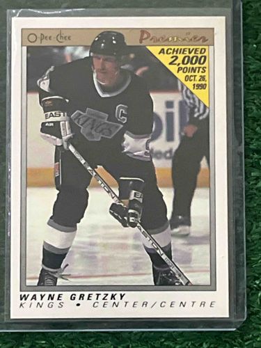 This is a 1990-91 O-Pee-Chee Premier hockey trading card featuring the legendary Wayne Gretzky of the Los Angeles Kings. The card commemorates his historic achievement of reaching 2,000 career points on October 26, 1990. The card is standard size (2.5" x 3.5") printed on semi-glossy white cardstock. The front design features a full-color action photograph of Gretzky in his black away Kings jersey, accented by a gold foil 'Premier' logo and an 'O-Pee-Chee' brand mark in the top left. A yellow triangular banner in the top right specifies the 2,000-point milestone. The bottom border contains his name, team, and position in clean sans-serif typography. The card appears to be in an 'ungraded' state but is housed in a clear protective plastic sleeve. Visually, the centering appears relatively balanced, with clean white borders and sharp corners typical of the 'Premier' line, which was marketed as a high-end alternative to standard sets. No significant surface scratches, creases, or edge chipping are immediately visible in the image, though the plastic sleeve may obscure fine detail. This card represents a significant era in hockey history, documenting one of the sport's most unbreakable records.