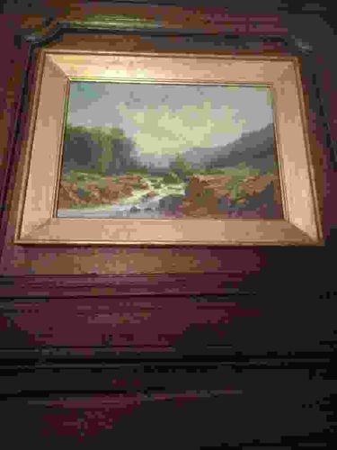 This item is an original oil painting on canvas or board, depicting a lush, Impressionist-style landscape. The composition features a central, winding stream or pathway leading into a misty background under a soft, overcast sky. The palette consists of earthy browns, mossy greens, and muted yellows, typical of 19th or early 20th-century landscape art. The brushwork appears painterly and textured, suggesting a mid-to-late 19th-century influence, possibly mimicking the Barbizon School. The artwork is housed in a substantial, beveled wooden frame finished with a gold-toned or gilded wash. The frame shows significant depth, which provides a dramatic presentation for the horizontal vista. Regarding condition, there is visible darkening of the varnish layer, a common aging characteristic known as 'museum grime' or patina, which suggests the piece has some age, likely Victorian or Edwardian eras. The frame exhibits minor surface wear and small areas of loss to the gilding, consistent with its age. No visible maker's mark or signature is identifiable due to the photo quality, but the craftsmanship of the molding and the atmospheric perspective in the painting indicate professional level artistic skill.