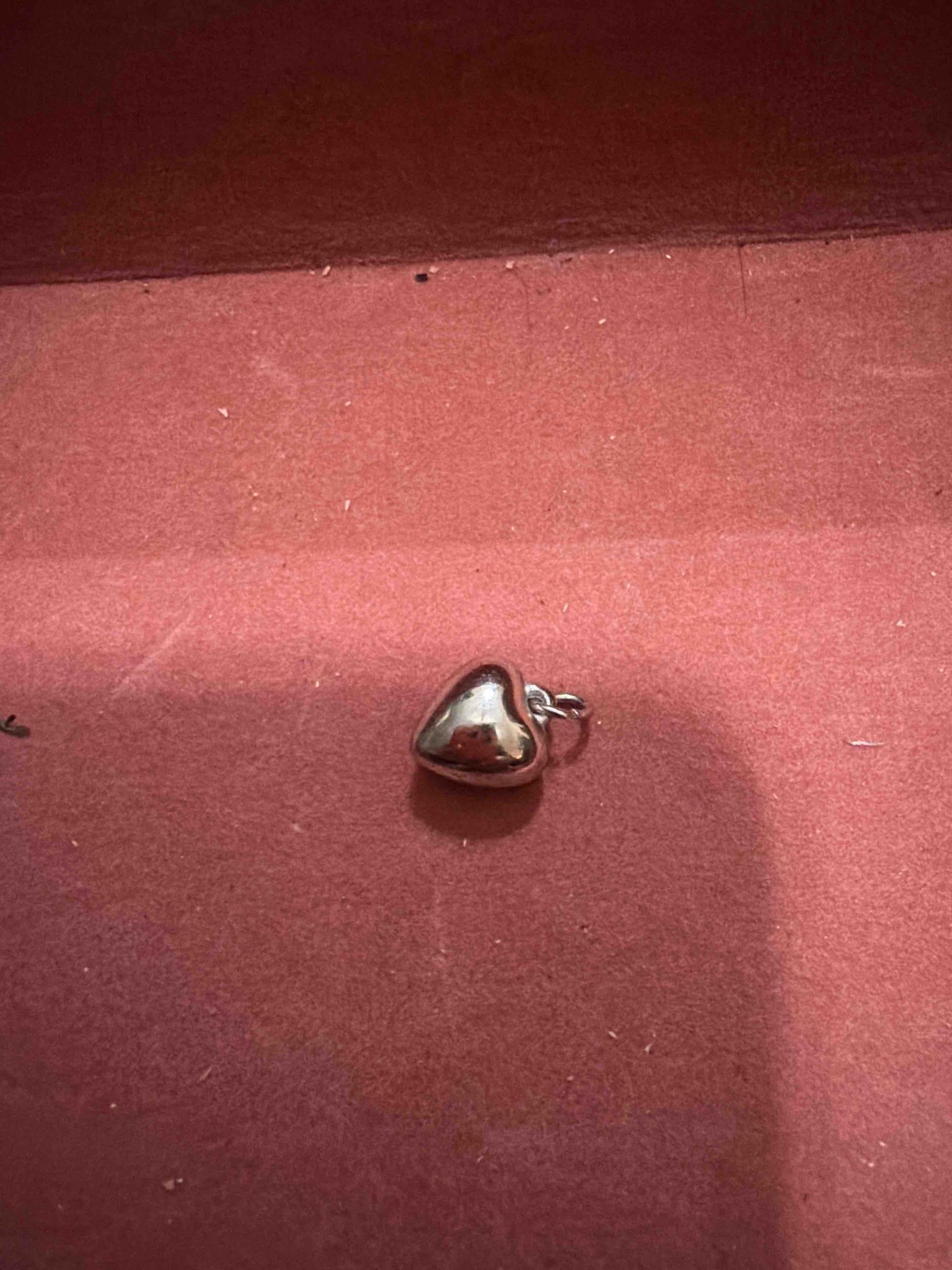 This item is a small, puffed heart charm or pendant, likely made of sterling silver or a similar silver-toned metal. The charm features a three-dimensional, 'puffed' construction, giving it a rounded, convex profile on both sides. Its surface is highly polished to a mirror-like finish, reflecting the surrounding light. In terms of size, it appears to be approximately 10mm to 15mm in width, though no scale is provided. It is attached to a small, circular jump ring that appears to be hand-closed, used for threading through a chain or attaching to a bracelet. The craftsmanship is clean with smooth seams, characteristic of mass-produced yet quality boutique jewelry from the late 20th to early 21st century. Condition-wise, the piece shows light surface scratches and minor micro-pitting consistent with gentle wear. No visible hallmarks are present in this view, although they would typically be found on the jump ring or the side of the heart. The overall style is a classic, minimalist romantic design that remains a staple in contemporary jewelry collections.