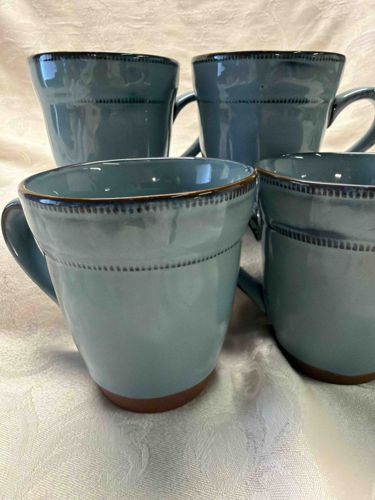 Set of Four Teal Beaded Rim Stoneware Mugs