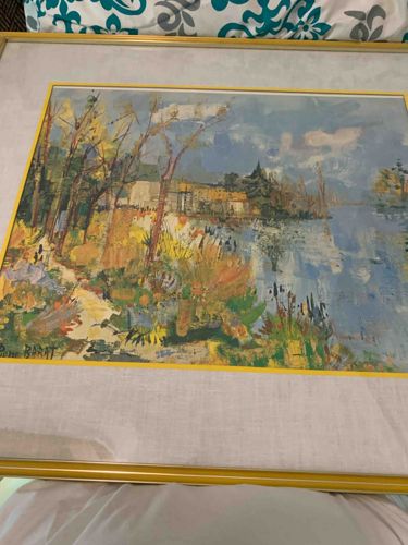 This is an impressionistic or post-impressionistic style landscape painting attributed to the artist Pierre Barat, as indicated by the signature in the lower-left corner. The artwork depicts a serene lakeside or riverside scene with a cluster of buildings in the mid-ground, possibly a small village or estate, nestled among autumn-toned foliage and slender trees. The color palette is vibrant yet balanced, utilizing shades of blue and gray for the sky and water, contrasted with warm ochres, yellows, and oranges in the vegetation. The technique features expressive, visible brushstrokes and impasto-like texture, suggesting a late 20th-century creation. The piece is housed in a contemporary gold-toned metal frame with a wide, textured off-white fabric or linen matting and a thin yellow inner accent border. Regarding condition, the artwork appears well-preserved behind glass, though the frame shows minor signs of handling. The composition demonstrates a sophisticated understanding of light and reflection on the water's surface, characteristic of Barat's loose, atmospheric style during the mid-to-late 1900s.