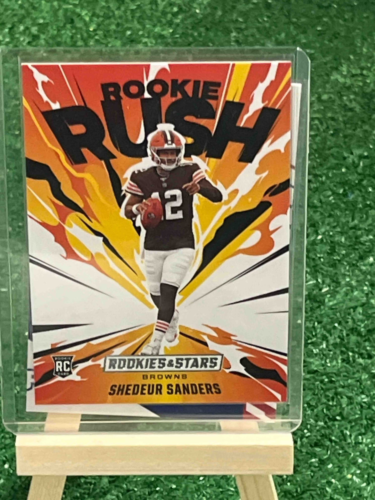 This is a modern collectible sports trading card measuring approximately 2.5 by 3.5 inches, featuring Shedeur Sanders. The card is designed with a high-action 'Rookie Rush' insert aesthetic, utilizing a vibrant comic-book style background with explosive orange, yellow, and red sunburst rays and fire motifs. The athlete is depicted in a Cleveland Browns uniform, holding a football in a dynamic pose. Notably, the bottom of the card displays the 'Rookies & Stars' logo and an 'RC' (Rookie Card) shield. The construction appears to be standard cardstock with a glossy finish. It is currently housed in a clear protective top-loader and displayed on a miniature wooden easel against a textured green background. It is important to note that as of the 2023-2024 period, Shedeur Sanders was a collegiate athlete; therefore, this card represents a 'custom' or 'art' card mockup rather than an official NFL-licensed Panini release, as the player has not yet been drafted by the Browns or reached the professional league at the time of this template's use. The condition appears to be near-mint with sharp corners and vibrant color saturation, though the centering and edges are obscured slightly by the plastic holder.