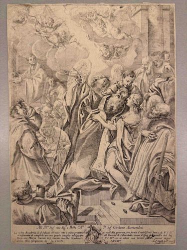 This item is an antique copperplate engraving (Kupferstich) on paper, depicting the solemn 'Last Communion of Saint Jerome.' The composition is densely populated with figures, rendered with intricate cross-hatching and fine linework characteristic of 17th-century European printmaking. It appears to be based on the famous Neoclassical/Baroque composition by Agostino Carracci or Domenichino. The central focus is the elderly, emaciated Saint Jerome kneeling to receive the Eucharist, surrounded by attendants and clerics in liturgical vestments, while cherubs descend from the heavens above. The print includes a significant lower margin with a formal Italian inscription and a central decorative crest, identifying the dedicatee as Girolamo Almerici. The paper shows signs of aging, including a distinct sepia-toned patina, minor foxing throughout, and some softening or slight creasing at the edges. No major tears or repairs are immediately visible on the face, but the margins appear slightly uneven, suggesting it may have been trimmed from a larger sheet. The mastery of light and shadow (chiaroscuro) achieved through the density of the engraving lines indicates a high level of craftsmanship from a skilled printmaker of the period. The work exemplifies the Late Mannerist to Early Baroque stylistic transitions, prioritizing emotional intensity and anatomical detail.