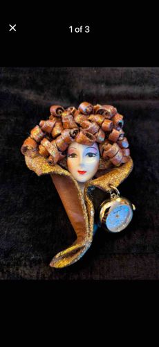 This unique piece of vintage fashion jewelry is a figural brooch featuring a hand-painted ceramic or porcelain lady's face set against an avant-garde collar design. The woman's face is rendered with delicate features, including red lips and shaded eyeshadow in blue and pink tones, reminiscent of Art Deco or 1980s theatrical styles. Above the face is a voluminous hairstyle composed of tightly curled, brown metallic-finished leather or resin ringlets. The garment collar is fashioned from a textured, gold-speckled brown material, possibly leather or a stiffened fabric, which tapers down into a sharp point. Appended to the left side of the collar is a small, functional gold-tone round pendant watch with a white dial and black numerals. The overall construction suggests a handmade or boutique artisan piece, likely dating from the late 20th century. The craftsmanship is highly detailed, particularly in the sculpting of the hair and the fine painting of the face. While no maker's marks are visible in the front view, the materials show light patina and minor surface wear consistent with age, but the overall structural integrity appears sound with the watch attachment remaining secure.