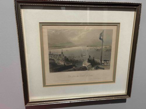 This item is an antique hand-colored steel engraving titled 'View from the Citadel of Quebec', likely a mid-19th-century print based on a drawing by artist William Henry Bartlett. The artwork depicts a panoramic topographical view of Quebec City, the St. Lawrence River, and the surrounding landscape from an elevated fortification. The central composition features various sailing vessels on the water, detailed military figures on the ramparts in the foreground, and the iconic architectural skyline of the lower town. The print is rendered in a Romantic topographical style, characteristic of early Victorian era travel publications. It is professionally housed in a multi-layered presentation: an inner double mat with a sage-green bevel, an antique-white primary mat, and a dark wood frame with a beaded inner edge and a gilded silver-tone sight edge. Physical condition shows visible age-related darkening of the paper (foxing or toning) and several scuff marks along the wooden frame's perimeter, indicating some wear to the finish. The text below the image includes the title in a cursive script and likely credits the engraver and publisher, identifying it as a historical document of Canadian colonial life. The craftsmanship of the engraving demonstrates fine line work and delicate color washes applied to highlight the sky and water.
